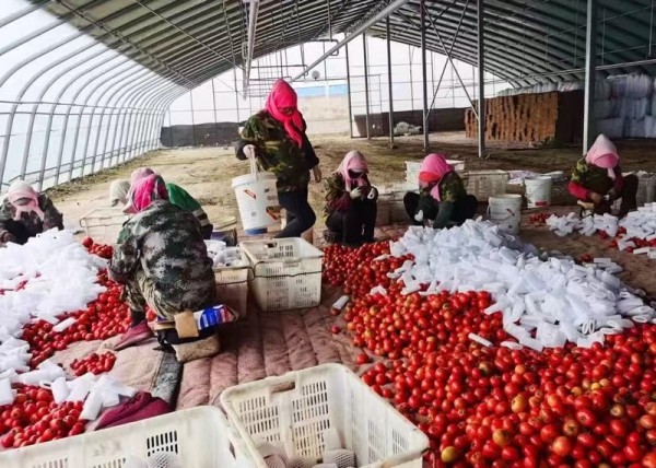 初秋時節(jié),永昌農場西紅柿迎來銷售旺季,走進農場示范園區(qū)的高標準鋼屋架拱棚內,蔥蔥郁郁的藤蔓上,掛滿了紅彤彤、沉甸甸的西紅柿,雇工人員正將成熟的西紅柿輕輕剪下裝桶,再運送到空棚內交由其他人員分揀、套網、裝箱、稱重、上車。