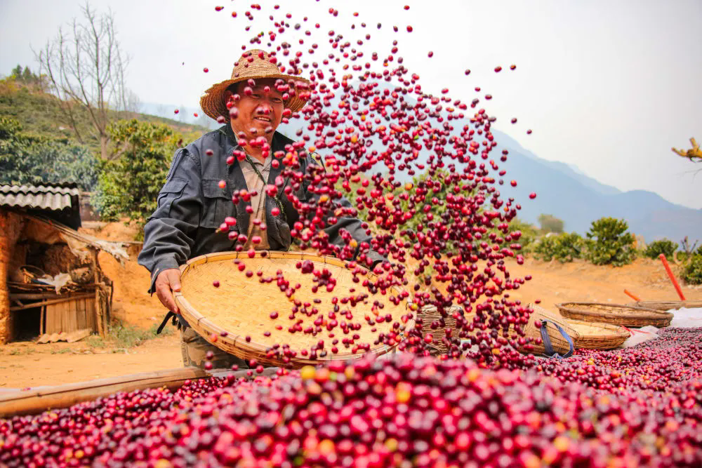 云南保山的咖農(nóng)在晾曬咖啡豆。昆明海關(guān) 供圖