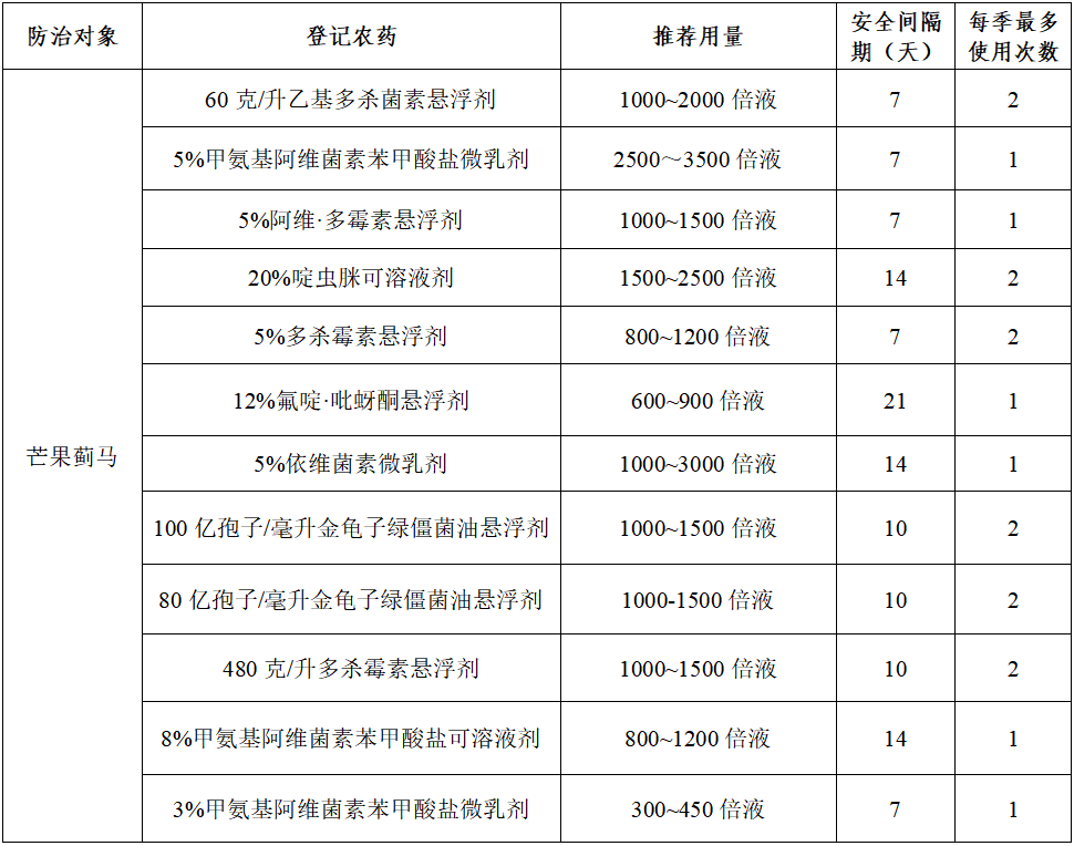 表   防治芒果薊馬可供選用的登記農(nóng)藥產(chǎn)品相關(guān)信息
