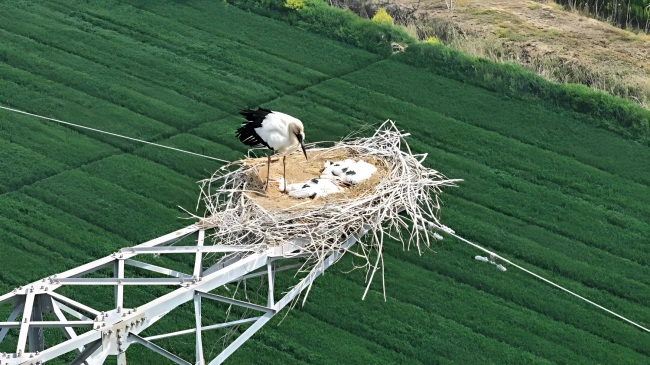 在濱淮農(nóng)場(chǎng)養(yǎng)殖中心旁的兩座電力鐵塔上,由枯枝搭建的巨型鳥(niǎo)巢格外醒目。被譽(yù)為“鳥(niǎo)界大熊貓”的國(guó)家一級(jí)重點(diǎn)保護(hù)野生動(dòng)物東方白鸛,已連續(xù)多年在此筑巢繁衍,今年更是有兩窩共8只幼鳥(niǎo)破殼而出,正健康成長(zhǎng),成為春日濱淮農(nóng)場(chǎng)一道靈動(dòng)的生態(tài)風(fēng)景線。