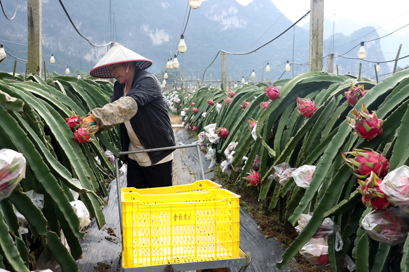 呂俊廣介紹,基地種植的品種是紅寶龍紅心火龍果,目前已經(jīng)接到了不少預(yù)定定單,累計(jì)有80萬斤,眼下正按照訂單計(jì)劃持續(xù)采收,按現(xiàn)在價(jià)格每斤4.5元計(jì)算,預(yù)計(jì)產(chǎn)值約350萬元。訂單主要來源于西安、北京等城市,合作社已經(jīng)跟郵政部門建立起完善的冷鏈物流網(wǎng)絡(luò),確保新鮮火龍果能24個(gè)小時(shí)到達(dá)消費(fèi)者手上。春節(jié)前訂單激增,基地每日臨時(shí)聘用40至50名臨時(shí)工,后續(xù)將根據(jù)采收量靈活調(diào)整用工。